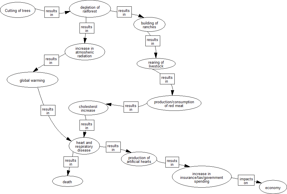 An example was given from the health system, and the following chain of events is being observed: Cutting down trees in the rain-forest causes global warming, and using the cut down trees to build ranches for red meat could introduce some long terms effects. The effects include health conditions such as heart failure, and government spending on the production of artificial hearts. To illustrate this further, the following systemigram is used to depict the impact of cutting down trees on the economy.